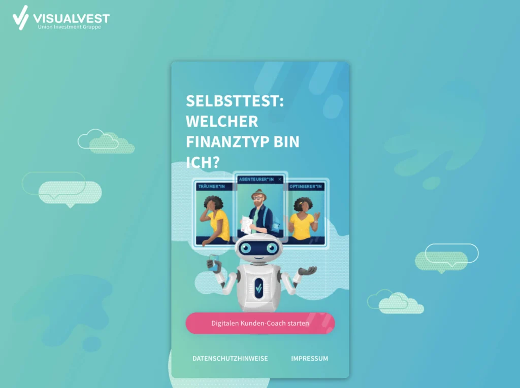 Our partner, VisualVest, is a digital asset manager. The company was founded in 2015 as a 100% subsidiary of Union Investment Group, combining the financial expertise and security of one of Germany’s leading asset management companies with the flexibility and speed of a FinTech. With VisualVest, individuals can invest their money in broadly diversified portfolios of ETFs or investment funds.