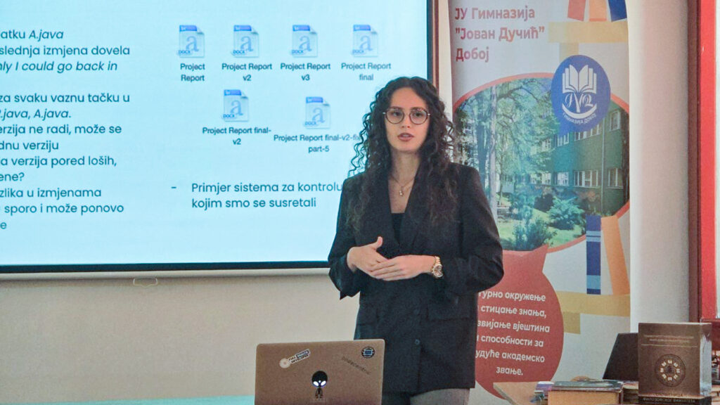 Our software engineer and former student of this school, Magdalena Šljivić, delivered an engaging talk on the basics of Git — one of the most important tools in modern software development.