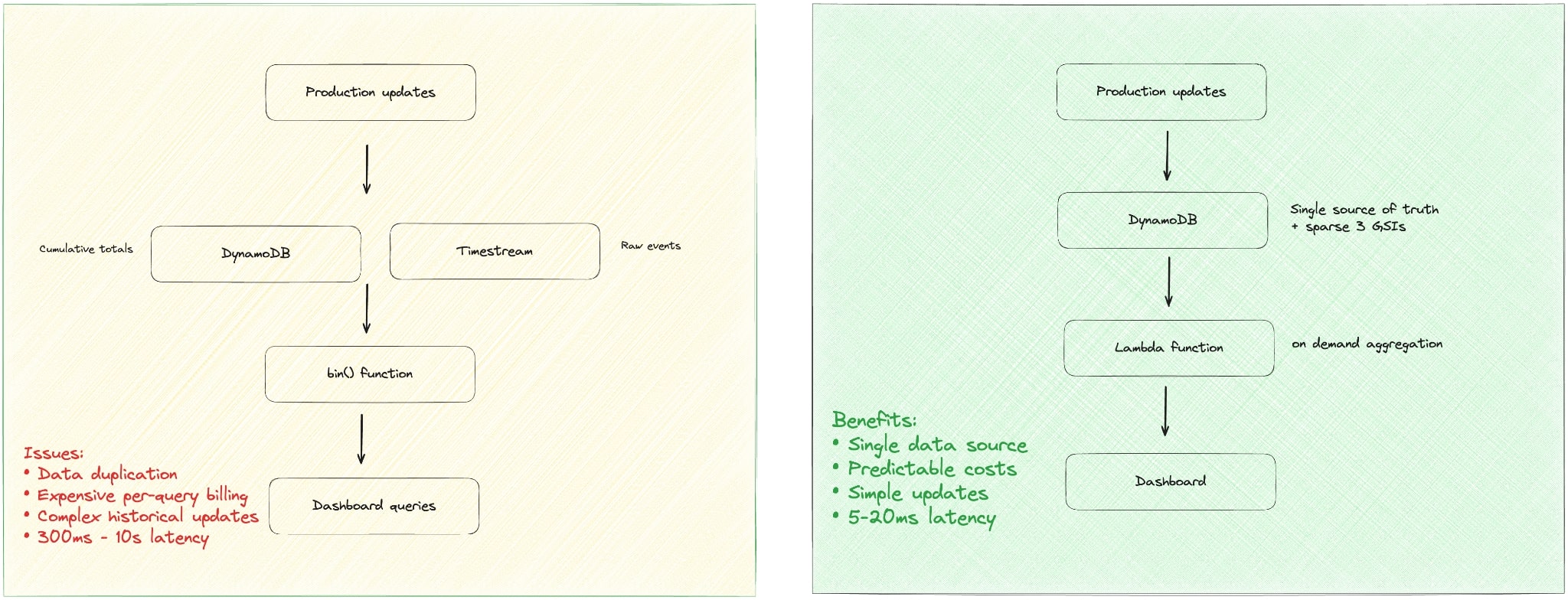 - Data duplication: We were maintaining the same state in two places: DynamoDB held the cumulative total, while Timestream stored the raw events solely for binned queries.